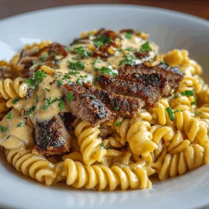 - Pour in heavy cream, simmer until sauce thickens, then add pasta and sliced steak, stirring in Parmesan.