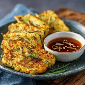 First, preheat your oven to 150°C (300°F) to keep your pancakes warm while you fry up the rest. Begin by preparing the dipping sauce—mix soy sauce, vinegar, sesame oil, and sugar until smooth. It’s the perfect companion to your Crispy Pancakes.